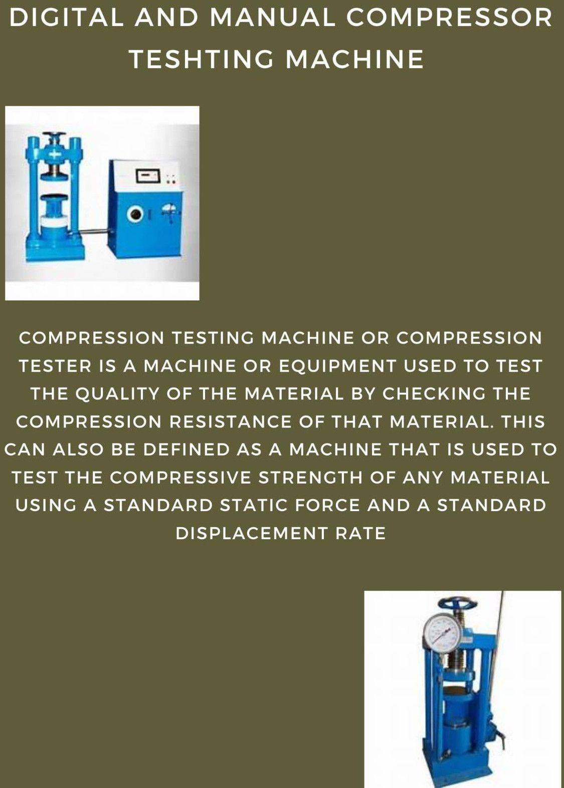 Compression testing machine or compression tester is a machine or equipment used to test the quality of the material by checking the compression resistance of that material. This can also be defined as a machine that is used to test the compressive strength of any material using a standard static force and a standard displacement rate.